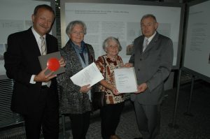 Käthe Säckel und Ute Süßmilch nehmen den Preis von Günther Beckstein entgegen.
